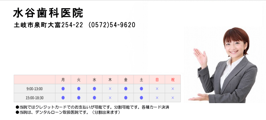土岐市で「予防歯科」「審美歯科」「小児歯科」をお探しの方におすすめの歯科医院です。 水谷歯科医院は、痛みに弱い方や歯医者が苦手な方にも やさしく寄り添う地域の歯科医院です。 患者さまからの嬉しいお声