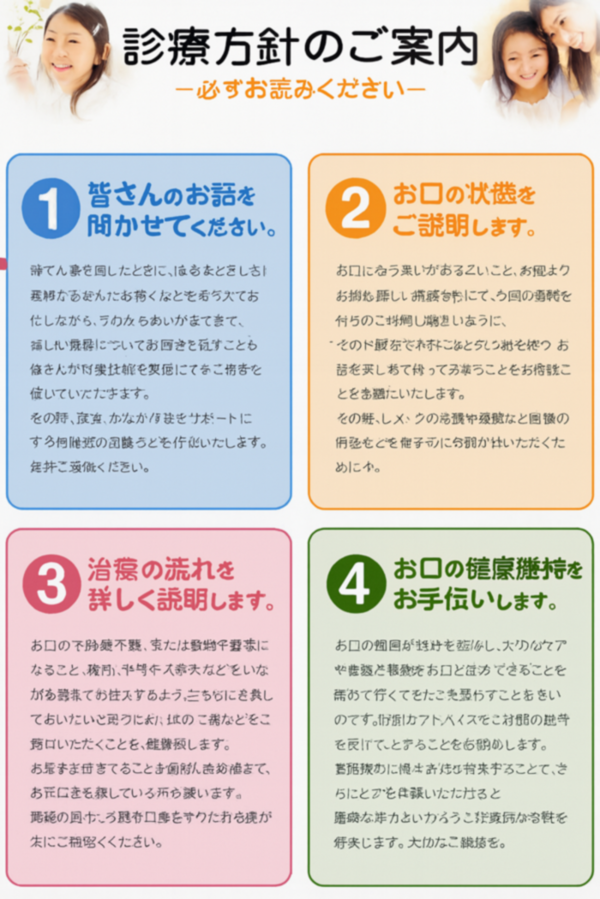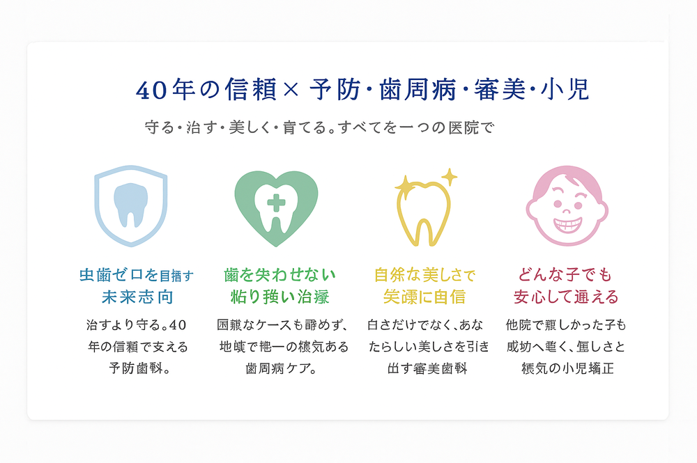 治療方針(差別化ポイント)当院では、次の3つを治療の基本としています。 1. 痛みを最小限にする工夫表面麻酔・細い針・ゆっくり注入(電動注射器)加温麻酔液など、痛みを抑える技術を徹底。 2. 丁寧でわかりやすい説明模型・写真・イラストを使い、納得してから治療へ進みます。 3. 無理に進めない治療特にお子さまは「できるところまで」。(まず心を開かせ、お友達感覚になる) 小児歯科への想い(地域ニーズに直結)「他院では泣いてしまったけれど、ここではできた」 絶対に怒らない 驚異的な粘り ゆっくり慣れる時間 やさしい声かけ 無理をしない治療 親御さんへの丁寧な説明 お子さまが歯医者さんを嫌いにならないよう、 👉 小児歯科ページへリンク 歯周病治療への想い 歯周病は“静かに進む病気”ですが、 当院では