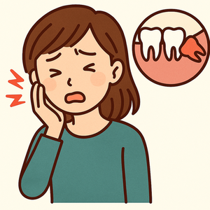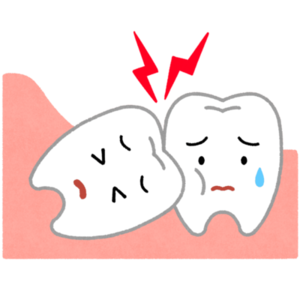 「なんでこんなに痛いの…?」という疑問に、視覚的に答えるのが次のイラストです。 B イラストで見る「押される痛み」の正体傾いた親知らずが隣の歯を押しつけている様子を表したイラストです。 多くの女性患者さんが、 C 放っておくと悪化しやすい理由親知らずの痛みは、自然に治ることもありますが、再発しやすい のが特徴です。 放置すると: