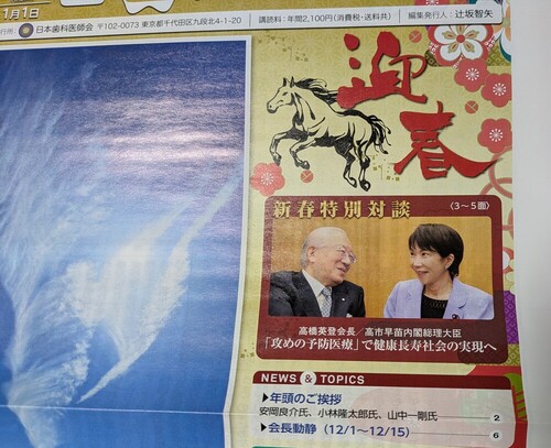 これらはすべて、人生の豊かさを支える大切な要素です。 当院は、地域の皆さまが“いつまでも自分らしく生きられる健康”を守るため、これからも予防医療に力を入れてまいります。 ■ 最後に新しい一年の始まりは、健康について改めて考える良いタイミングです。 「今年こそは歯の健康を整えたい」「しばらく検診に行けていない」「子どもの歯をしっかり守りたい」 そんな方は、ぜひ一度ご相談ください。 予防は、未来の自分への最高の贈り物です。 今年も皆さまの健康を全力でサポートいたします。 日本歯科医師会・日歯広報・高橋会長と高市総理との 新春特別対談より引用 |