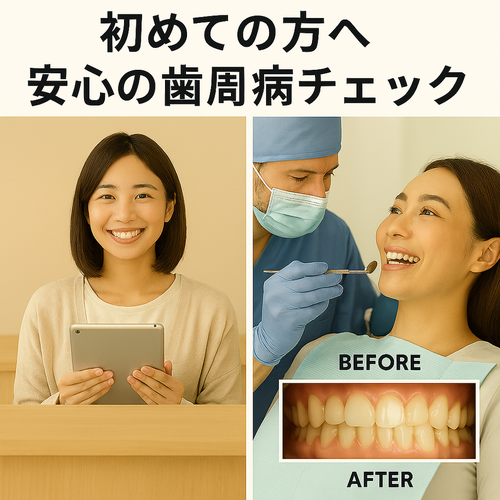 初診のご案内(歯周病編)歯科治療は「虫歯を治せば良い」「痛くなければ大丈夫」というものではありません。実は歯周病が静かに進行し、将来歯を失う原因となることが少なくありません。 🔍 初診時の流れ当院では初診時に、デジタルパノラマレントゲンによる総合的な観察と歯周病検査を行います。 💰 費用について初診時には検査や画像診断を行うため、一部負担金が通常よりかかる場合がございます。あらかじめご理解いただければ幸いです